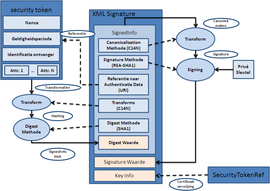 De Signature zoals beschreven. De Signature en het daarbij gebruikte certificaat met de publieke sleutel kan als KeyInfo in het security token geïntegreerd zijn.