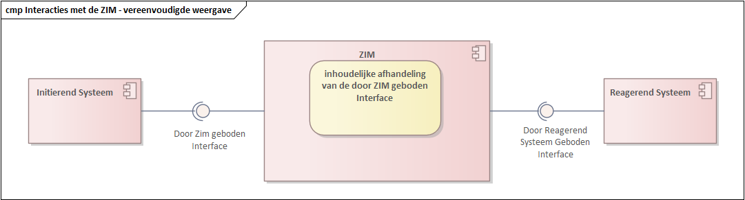 De volgende hoofdstukken concentreren zich op de door de ZIM aangeboden interfaces en de componenten die binnen de ZIM verantwoordelijk zijn voor de inhoudelijke afhandeling. Daarom worden de orchestratieservice en het vaste patroon van aanroepen van componenten niet steeds opnieuw getoond. Het diagram AORTA.ALG.d1060.1 kan versimpeld worden weergegeven zoals getoond in diagram AORTA.ALG.d1070. Hierbij zijn de orchestratieservice en overige componenten weggelaten en wordt de service van de component die verantwoordelijk is voor de inhoudelijke afhandeling van de door de ZIM geboden interface direct toegekend aan de door de ZIM geboden interface. Dit is de notatieconventie die verder in de tekst wordt gevolgd.