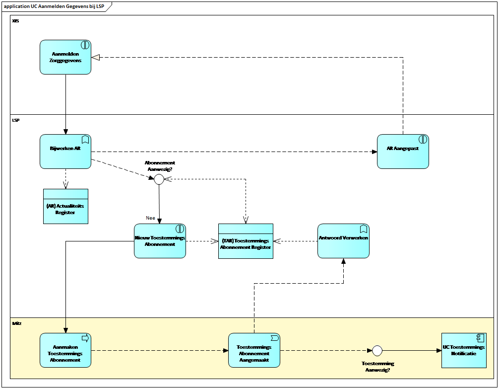 Na dit aanmelden gaat het LSP kijken of er wel een toestemming abonnement is afgenomen voor deze zorgapplicatie voor deze BSN. Deze abonnementen worden voor het LSP door Mitz bijgehouden in het toestemming abonnement register.