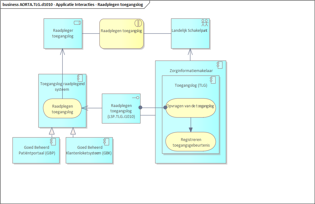 Deze situatie is weergegeven in een diagram AORTA.TLG.d1010. De interfaces worden hier kort behandeld. Zie voor meer detail het [Ontw TLG].