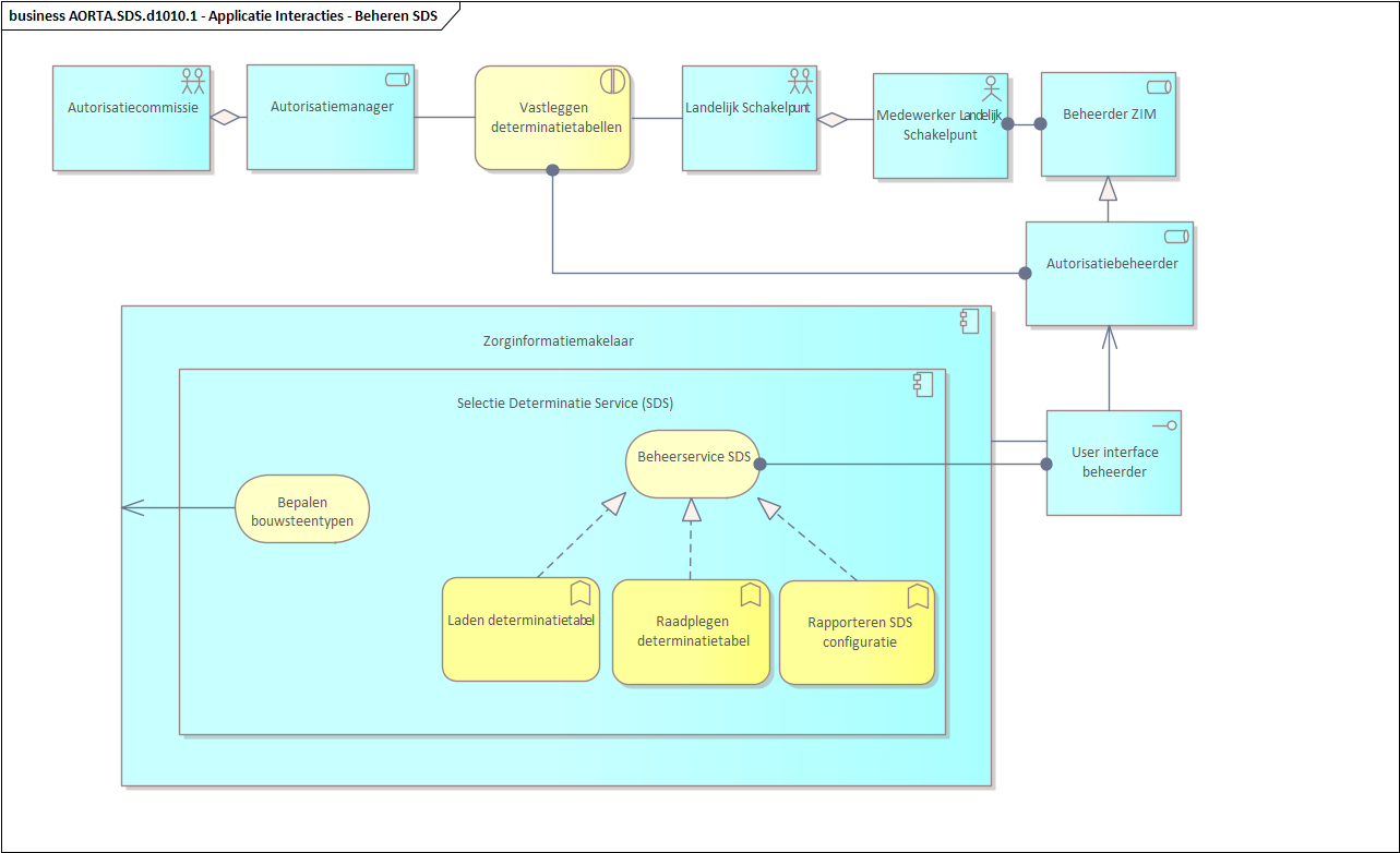 Diagram AORTA.SDS.d1010 - informatiesysteeminteracties voor het beheer van de Selectie en Determinatie Service