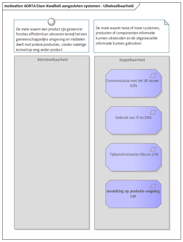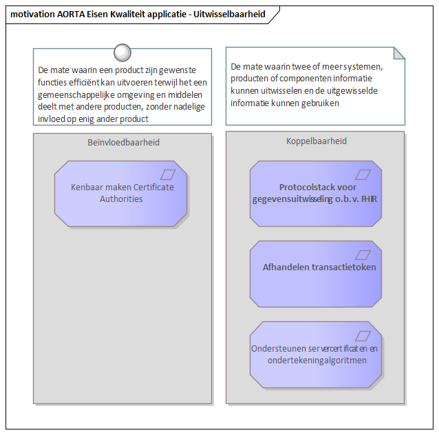Figure 4 : AORTA Eisen Kwaliteit aangesloten systemen - Uitwisselbaarheid ISO 25010 definieert Uitwisselbaarheid als: De mate waarin een product, systeem of component informatie uit kan wisselen met andere producten, systemen of componenten, en/of het de gewenste functies kan uitvoeren terwijl het dezelfde hard- of software-omgeving deelt. Dit diagram toont de subcategorieën zoals gedefinieerd door ISO 25010.