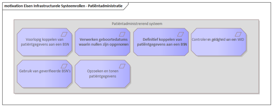Toelichting bij eis: Ieder GBZ moet over een patiëntadministratie beschikken, maar een XIS hoeft die niet per se in te bouwen. Het staat een GBZ vrij een eigen patiëntadministrerend systeem te kiezen dat voldoet aan de genoemde eisen. De systeemrol van Patiëntadministrerend systeem is daarmee niet verplicht voor XIS-typekwalificatie, maar een GBZ moet wel aantoonbaar over een dergelijk systeem beschikken en dit met het gebruikte XIS hebben gekoppeld om zodoende te kunnen garanderen dat er in de XIS-instantie met geverifieerde BSN's gewerkt wordt. Die gerefereerde eisen hoeven dan niet voor de XIS-typekwalificatie te worden ingebouwd.