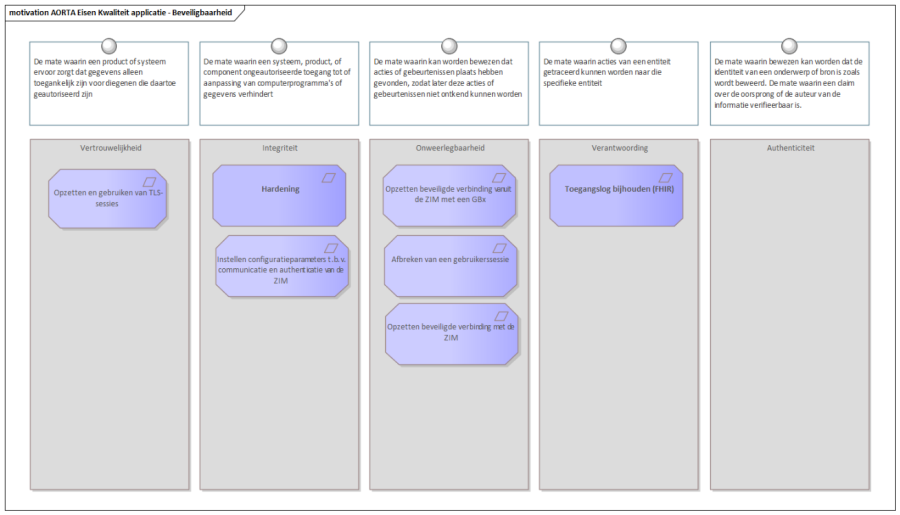 Figure 5 : AORTA Eisen Kwaliteit applicatie - Beveiligbaarheid ISO 25010 definitieert Beveiligbaarheid als: De mate waarin een product of systeem informatie en gegevens beschermt zodat personen, andere producten of systemen de juiste mate van gegevenstoegang hebben passend bij hun soort en niveau van autorisatie.