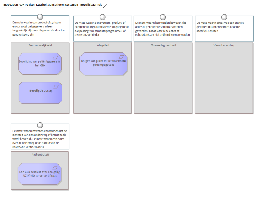 Figure 3 : AORTA Eisen Kwaliteit aangesloten systemen - Beveiligbaarheid ISO 25010 definieert Beveiligbaarheid als: De mate waarin een product of systeem informatie en gegevens beschermt zodat personen, andere producten of systemen de juiste mate van gegevenstoegang hebben passend bij hun soort en niveau van autorisatie.
