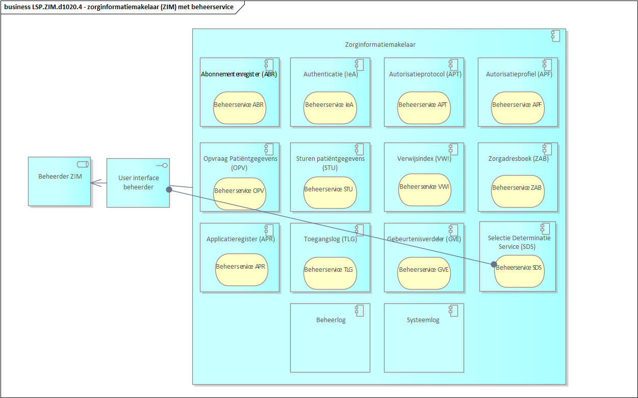 Diagram LSP.ZIM.d1020. toont op conceptueel niveau de beheerfaciliteiten van de ZIM. De ZIM beschikt over een gebruikersinterface die toegang geeft aan een beheerder voor het uitvoeren van beheeracties op elk van de componenten binnen de ZIM. Deze gebruikersinterface geeft de mogelijkheid om de toegang tot specifieke beheeracties te beperken tot beheerders in een meer specifieke rol. Weliswaar is op logisch niveau sprake van één beheerderinterface, op fysiek niveau kan sprake zijn van afzonderlijke interfaces voor deelcomponenten van de ZIM.