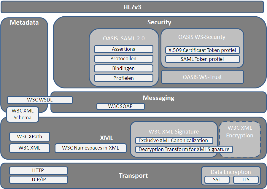 Vertrouwelijkheid. Berichten kunnen (deels) versleuteld worden. Hiervoor wordt de XML Encryption (W3C) specificatie geïmplementeerd.
