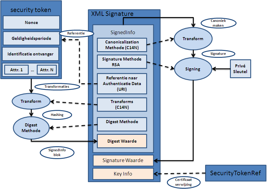 De Signature zoals beschreven. De Signature en het daarbij gebruikte certificaat met de publieke sleutel kan als KeyInfo in het security token geïntegreerd zijn.