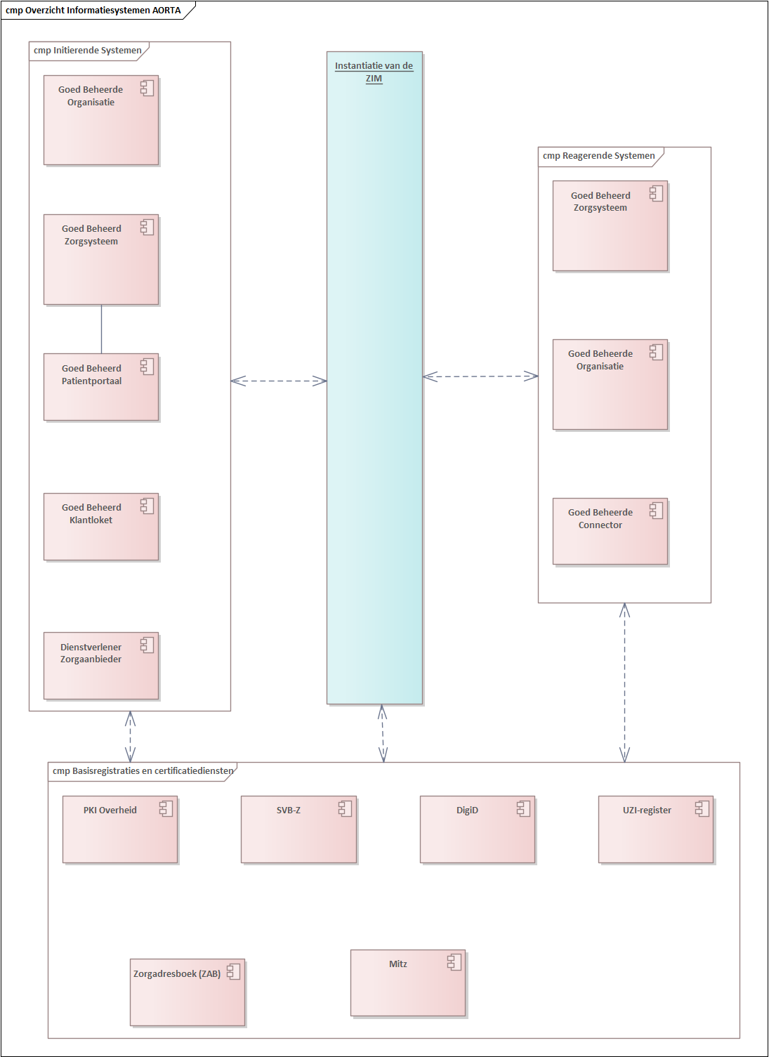 Centraal in AORTA staat de Zorginformatiemakelaar (ZIM) (zie pagina 'Zorginformatiemakelaar (ZIM)' ), die verantwoordelijk is voor de berichtuitwisseling tussen opvragende systemen en bronsystemen (en tussen sturende en ontvangende systemen).